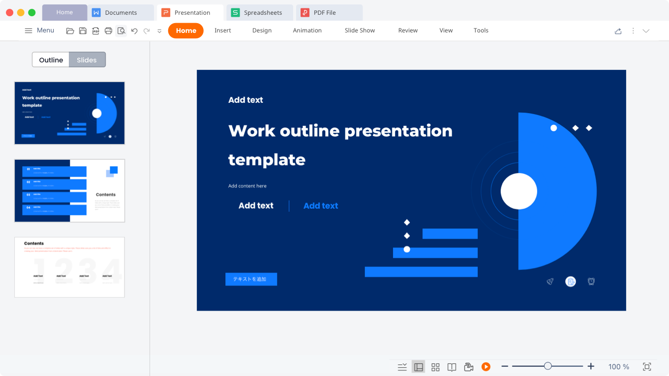 には、さまざまはテンプレート、背景画像、グラフが用意されています。Presentationのサポートを受けることで、教師はさまざまな講義用スライドを作成し、授業をおもしろくすることができ、学生は見栄えのよいプレゼンテーションを簡単に作成できます。