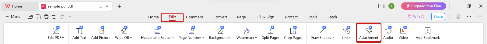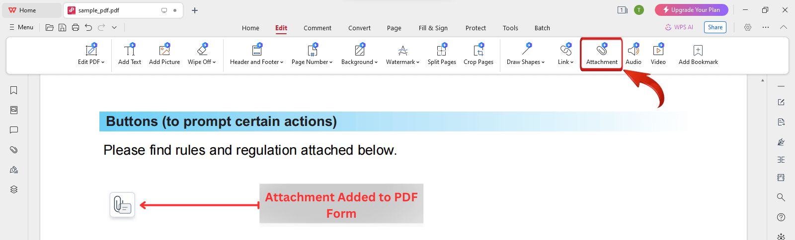 Bước 1: Để đính kèm một tệp, nhấp vào nút "Tệp Đính Kèm" trong Thanh Chỉnh Sửa, sau đó đặt con trỏ vào vị trí trong biểu mẫu PDF mà bạn muốn đính kèm tệp.
