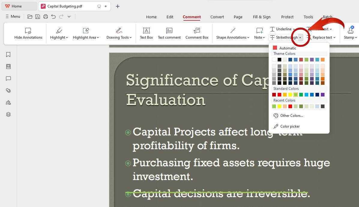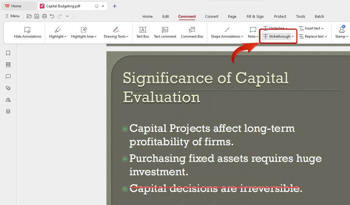 Bước 2: Tương tự, để gạch qua, nhấp vào nút Gạch Qua trong Thanh công cụ Bình luận, sau đó, sử dụng chuột của bạn, chọn văn bản có vẻ không liên quan.