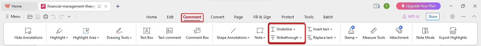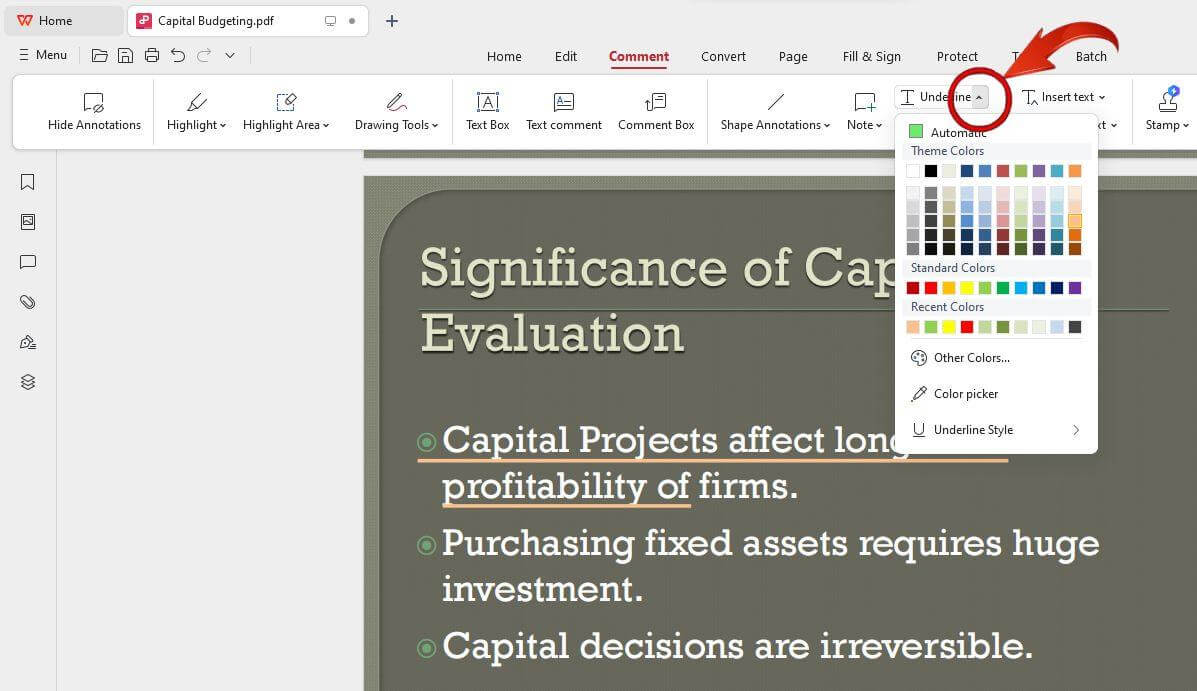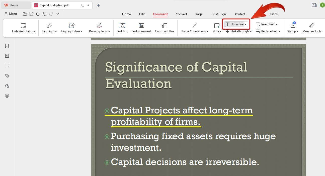 Bước 1: Để gạch dưới, nhấp vào nút Gạch Dưới trong Thanh công cụ Bình luận, sau đó sử dụng con trỏ của bạn để chọn văn bản mà bạn cần gạch dưới.