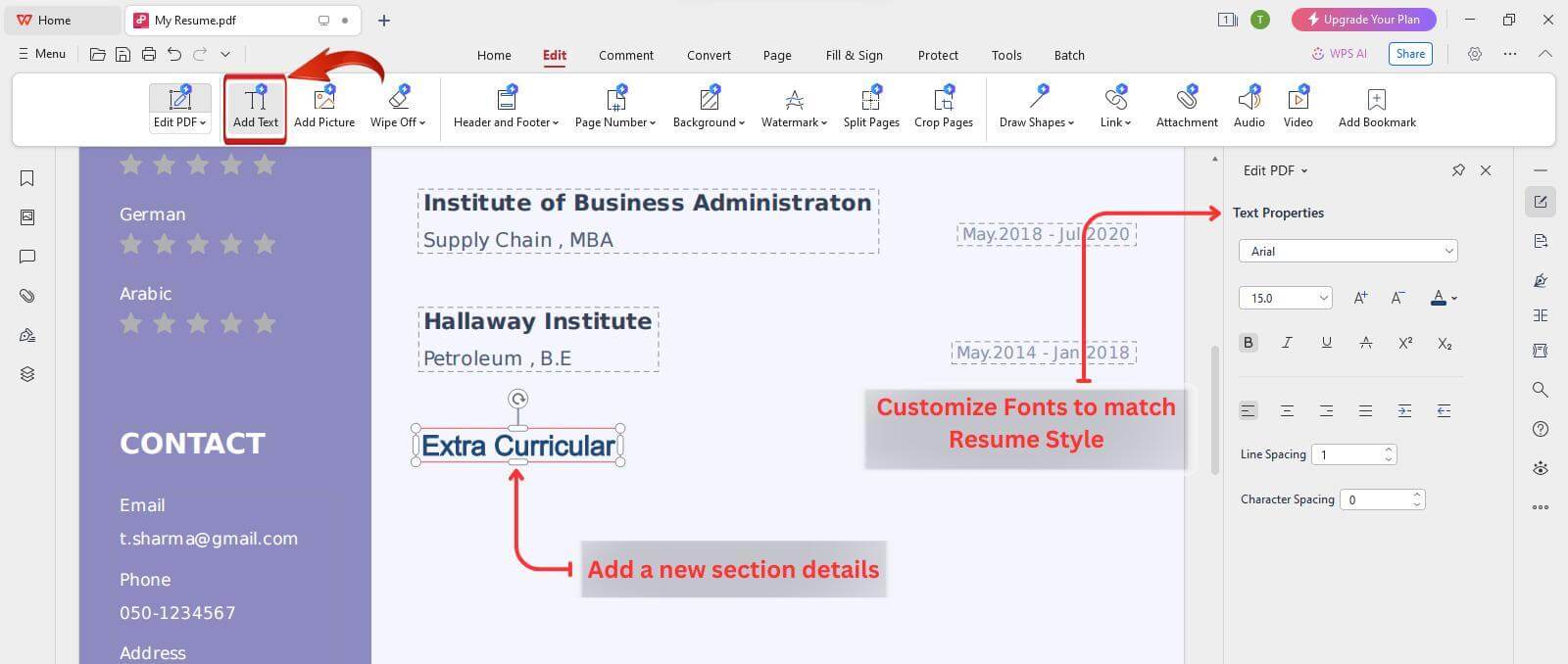 Bước 3: Để tùy chỉnh phông chữ, WPS PDF Editor cung cấp một bảng "Chỉnh Sửa PDF" mở ra ở bên phải giao diện khi bạn thêm văn bản. Tại đây, bạn có thể điều chỉnh kiểu phông chữ, kích thước và các tùy chọn định dạng khác để đảm bảo tính đồng nhất trên toàn bộ sơ yếu lý lịch của bạn.