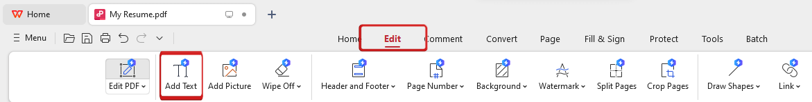 Bước 1: Để thêm một phần mới, nhấp vào nút "Thêm Văn Bản" trong Thanh Chỉnh Sửa, sau đó sử dụng con trỏ để đặt ô văn bản trong sơ yếu lý lịch PDF của bạn.