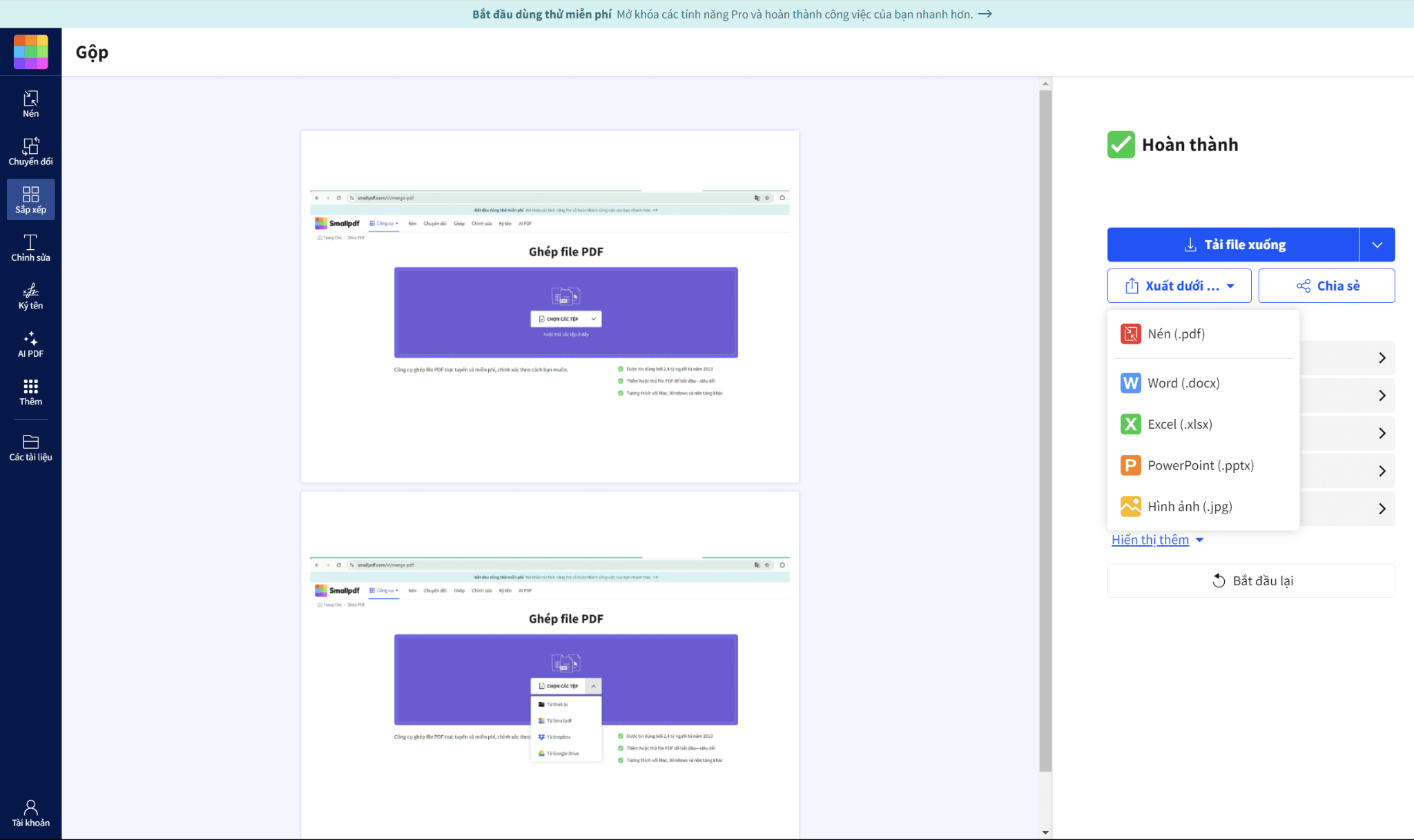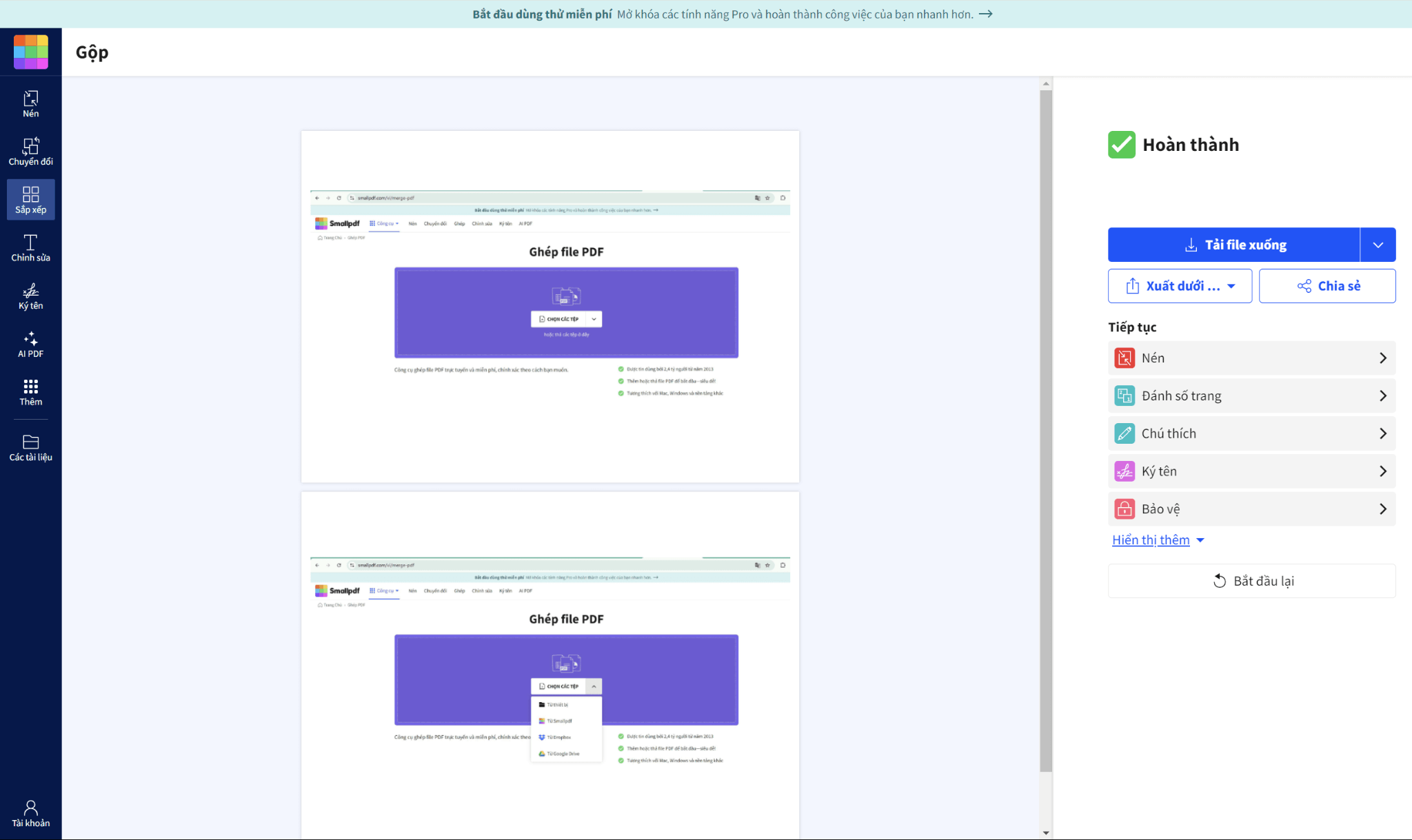 Phần hay nhất là toàn bộ quy trình có thể hoàn tất chỉ trong vài phút. Người dùng cũng có thể truy cập tất cả các tính năng cơ bản trên tất cả các Smallpdf merge PDFs miễn phí.