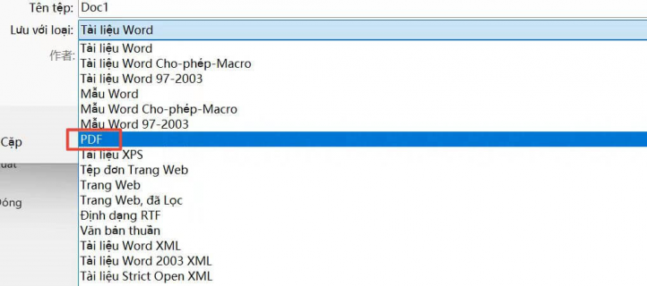 Bước 4: Chọn PDF từ danh sách định dạng tệp tin và nhấp vào Lưu